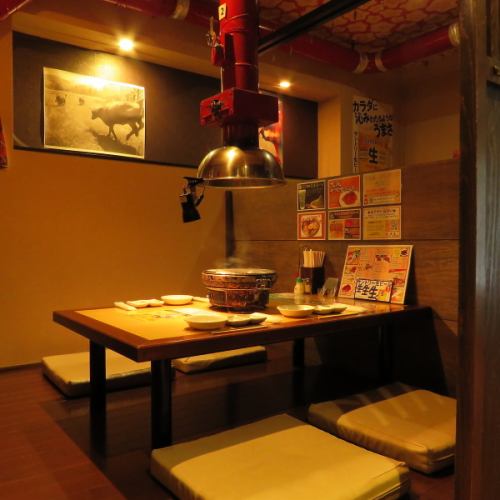 全席小上がり席で、居心地の良い空間をご提供!各テーブルにはダクトを完備しており、煙や匂いを気にせずにお食事を楽しめます♪ご家族での食事や女子会、仕事帰りの飲み会など、幅広いシーンでご利用いただけます!焼きたてのお肉を囲んで、皆さまの笑顔が溢れるひとときをお楽しみください♪
